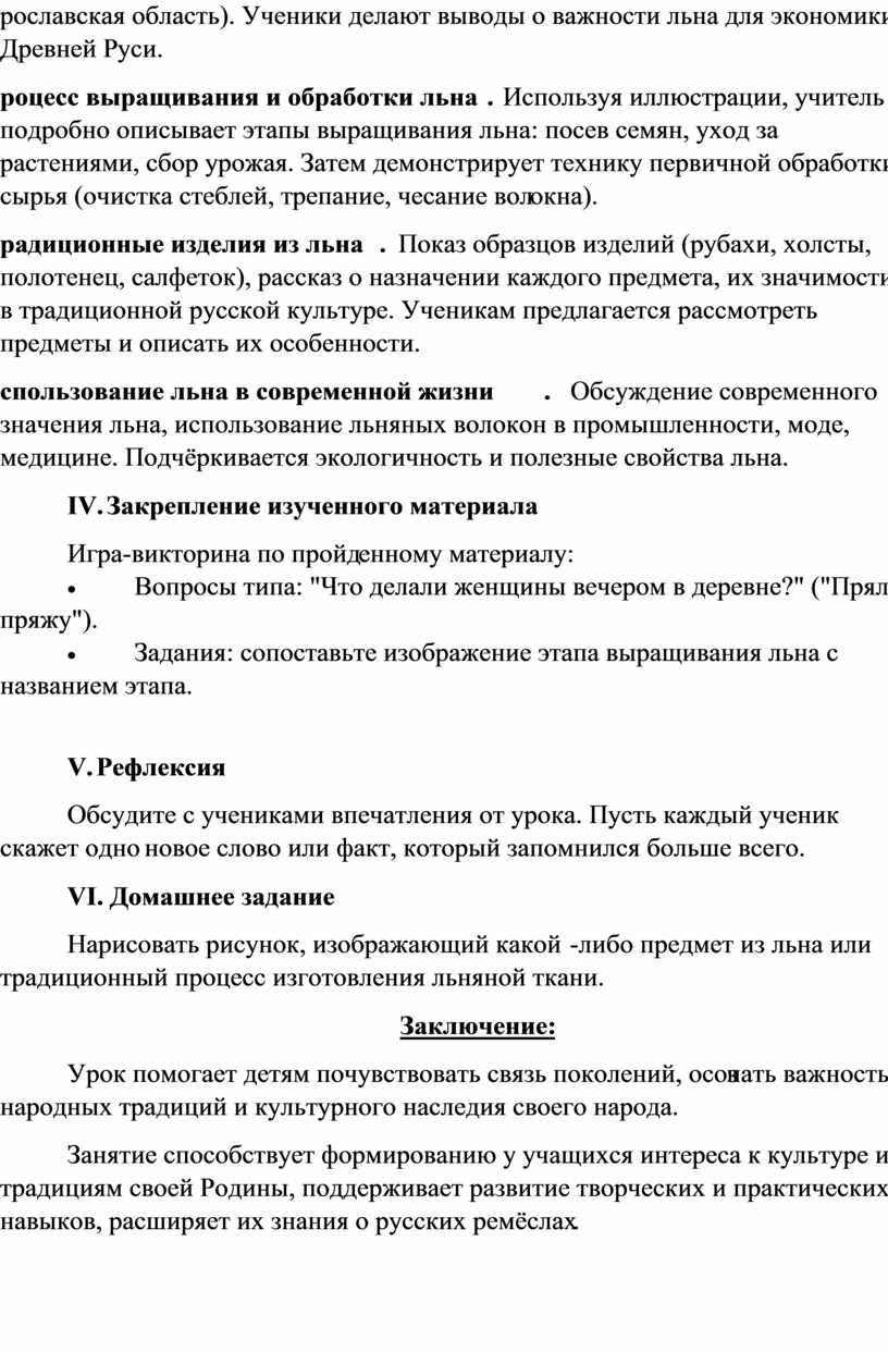 Познакомить учащихся с историей и традициями выращивания и обработки льна в России, показать значимость льняных изделий в русской культуре и повседневной жизни.
