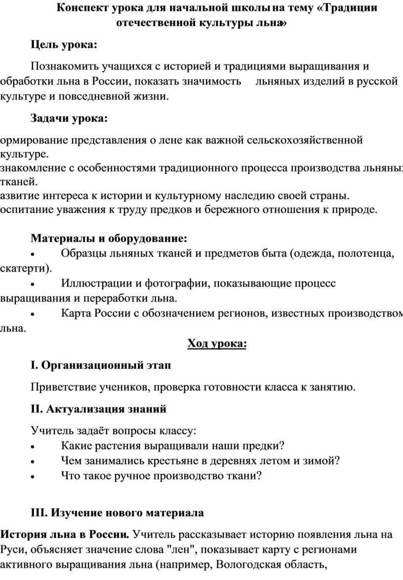 Конспект урока для начальной школы на тему «Традиции отечественной культуры льна»