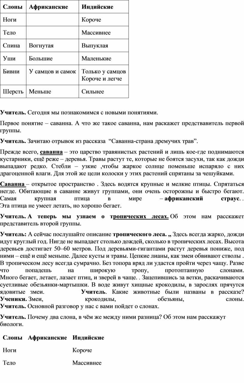 Учитель: У первой и второй группы в конвертах находятся вопросы, на которые они должны ответить в ходе исследовательской экспедиции. А потом познакомить всех остальных с результатами. У третьей группы – таблица, которую они должны будут заполнить, изучив слонов.