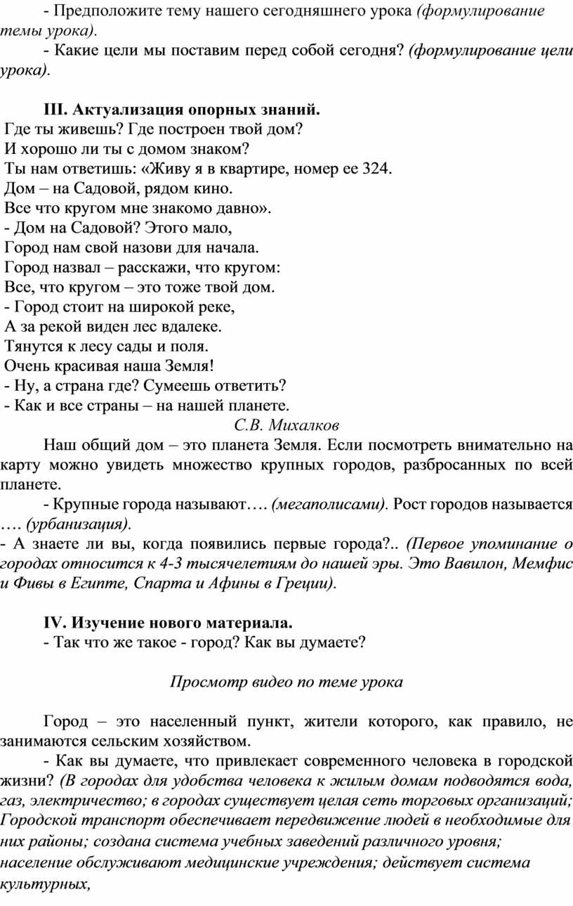 Люди давно селятся вместе, образуя деревни, посёлки и города, потому что вместе жить удобнее. И всё же большая часть людей живёт в городе. Почему? Что такое город? Чем городской житель отличается от жителя села? Вот на эти вопросы нам предстоит сегодня ответить. Речь пойдёт о местах, которые являются средой обитания человека – городе и жилище.