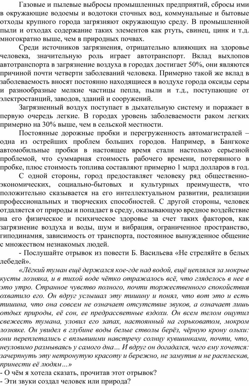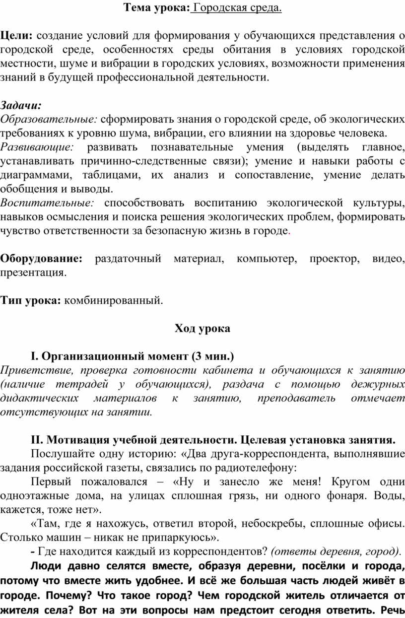 Цели: создание условий для формирования у обучающихся представления о городской среде, особенностях среды обитания в условиях городской местности, шуме и вибрации в городских условиях, возможности применения знаний в будущей профессиональной деятельности.