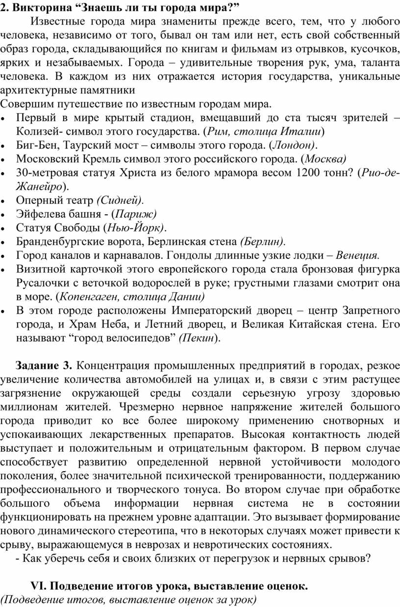 Задание 3. Концентрация промышленных предприятий в городах, резкое увеличение количества автомобилей на улицах и, в связи с этим растущее загрязнение окружающей среды создали серьезную угрозу здоровью миллионам жителей. Чрезмерно нервное напряжение жителей большого города приводит ко все более широкому применению снотворных и успокаивающих лекарственных препаратов. Высокая контактность людей выступает и положительным и отрицательным фактором. В первом случае способствует развитию определенной нервной устойчивости молодого поколения, более значительной психической тренированности, поддержанию профессионального и творческого тонуса. Во втором случае при обработке большого объема информации нервная система не в состоянии функционировать на прежнем уровне адаптации. Это вызывает формирование нового динамического стереотипа, что в некоторых случаях может привести к срыву, выражающемуся в неврозах и невротических состояниях.