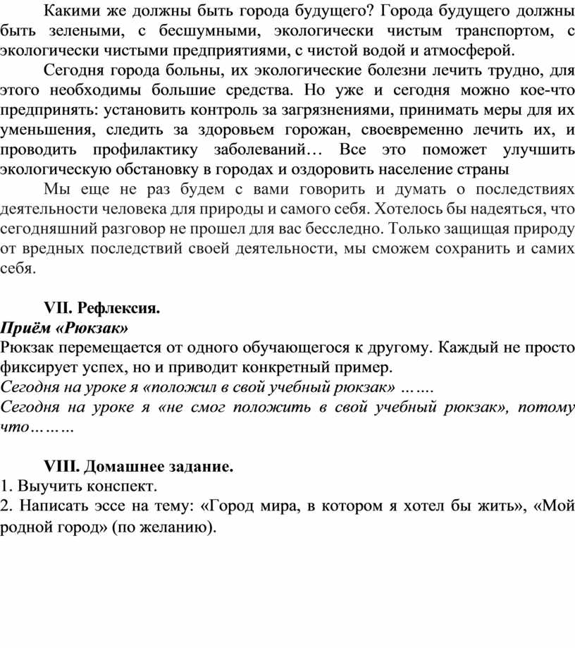 Какими же должны быть города будущего? Города будущего должны быть зелеными, с бесшумными, экологически чистым транспортом, с экологически чистыми предприятиями, с чистой водой и атмосферой.
