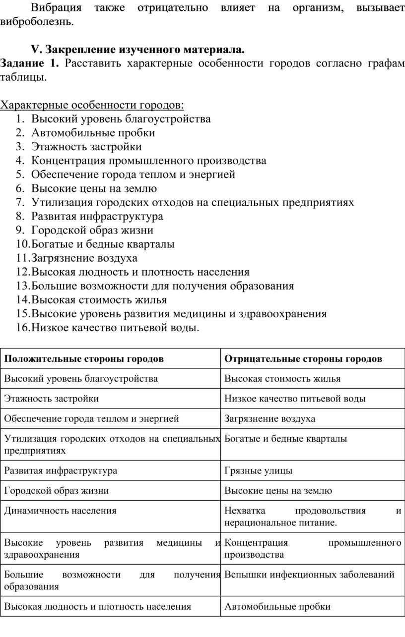 Задание 1. Расставить характерные особенности городов согласно графам таблицы.
