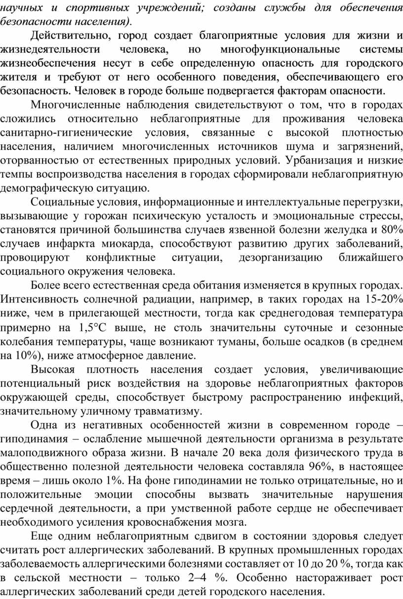Действительно, город создает благоприятные условия для жизни и жизнедеятельности человека, но многофункциональные системы жизнеобеспечения несут в себе определенную опасность для городского жителя и требуют от него особенного поведения, обеспечивающего его безопасность. Человек в городе больше подвергается факторам опасности.