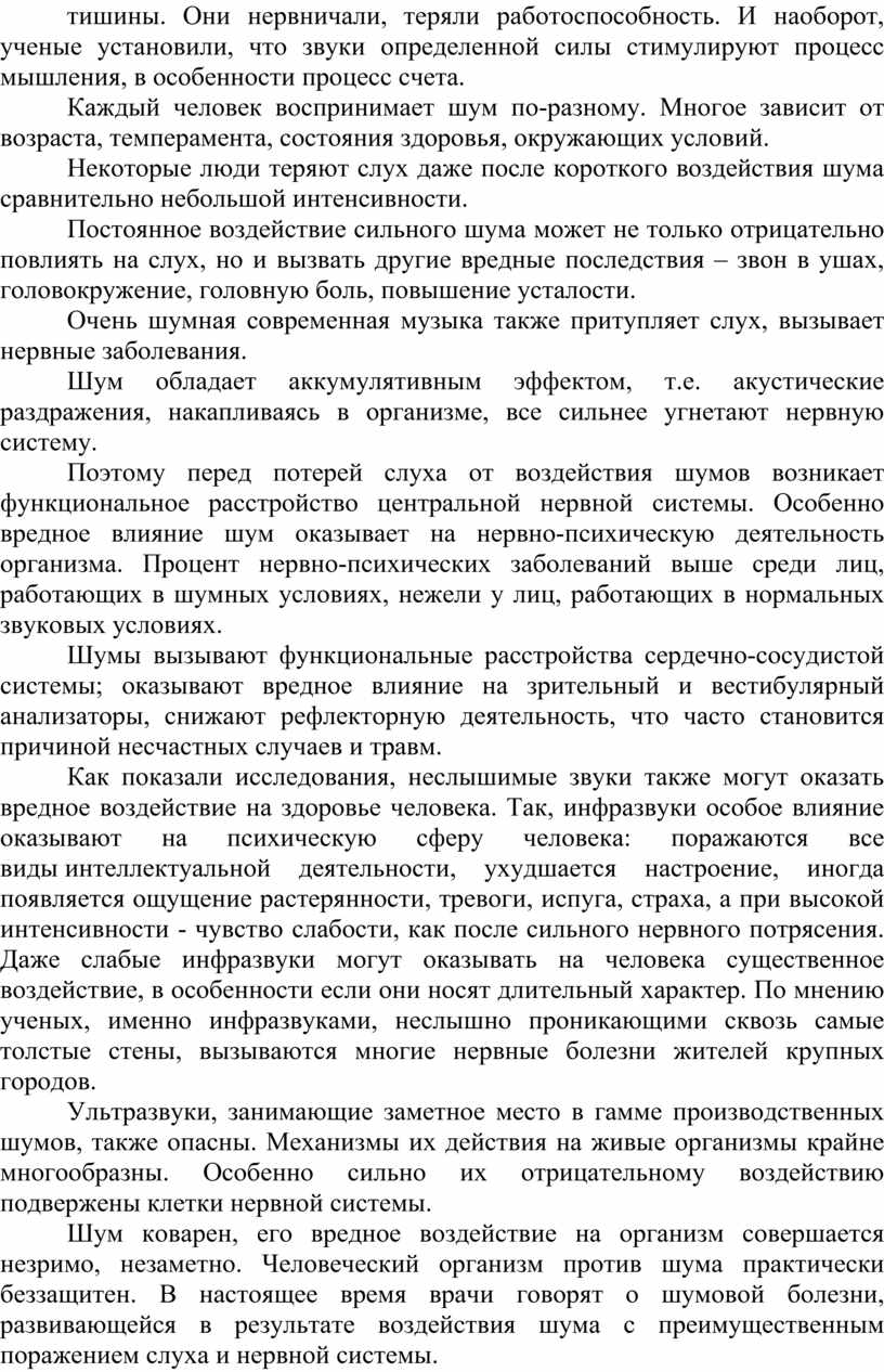 Шум коварен, его вредное воздействие на организм совершается незримо, незаметно. Человеческий организм против шума практически беззащитен. В настоящее время врачи говорят о шумовой болезни, развивающейся в результате воздействия шума с преимущественным поражением слуха и нервной системы.