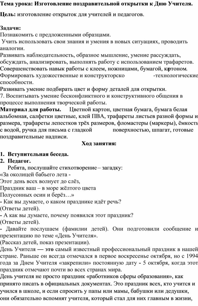 Тема урока: Изготовление поздравительной открытки к Дню Учителя.