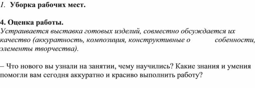 Устраивается выставка готовых изделий, совместно обсуждается их качество (аккуратность, композиция, конструктивные особенности, элементы творчества).