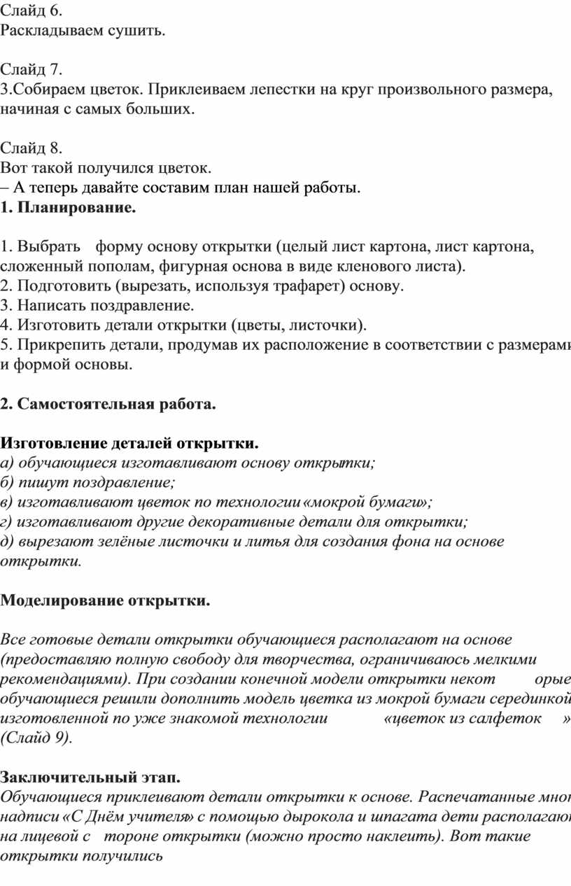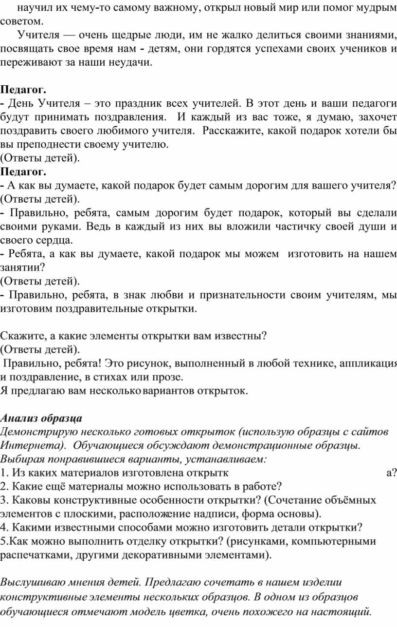 - Правильно, ребята, в знак любви и признательности своим учителям, мы изготовим поздравительные открытки.