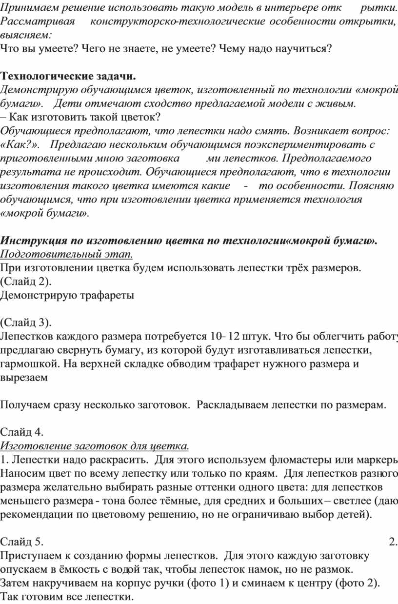 Выслушиваю мнения детей. Предлагаю сочетать в нашем изделии конструктивные элементы нескольких образцов. В одном из образцов обучающиеся отмечают модель цветка, очень похожего на настоящий. Принимаем решение использовать такую модель в интерьере открытки. Рассматривая конструкторско-технологические особенности открытки, выясняем: