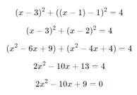 — После того как получили квадратное уравнение, что мы обычно находим? Ожидаемый ответ: Дискриминант, который показывает количество корней квадратного уравнения. — А что это значит для нашей задачи? Ожидаемый ответ: — Значит: · Если D>0, квадратное уравнение имеет два разных корня → прямая пересекает окружность в двух точках. · Если D=0, есть один корень → прямая касается окружности, только одна точка пересечения. · Если D<0, нет действительных корней → прямая не пересекает окружность, точек пересечения нет. — В нашем случае — После этого находим корни x и соответствующие y, чтобы определить координаты точек. Получаем: Две точки пересечения получились: (3;3) и (1;1) |