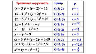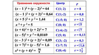 — Давайте вспомним, как выглядит уравнение окружности с центром в точке (x0,y0) и радиусом R? (Ожидаемый ответ (x−x0)2+(y−y0)2=R2 ) — Отлично. А теперь проверим, умеем ли мы определять центр и радиус по готовому уравнению.