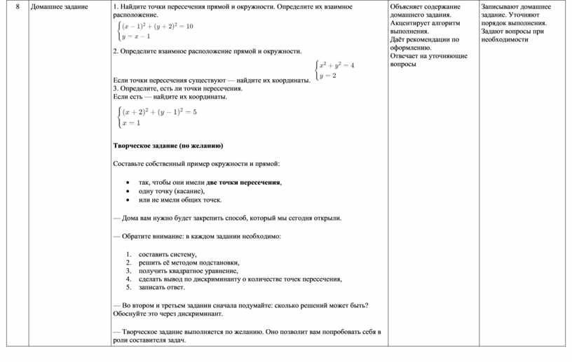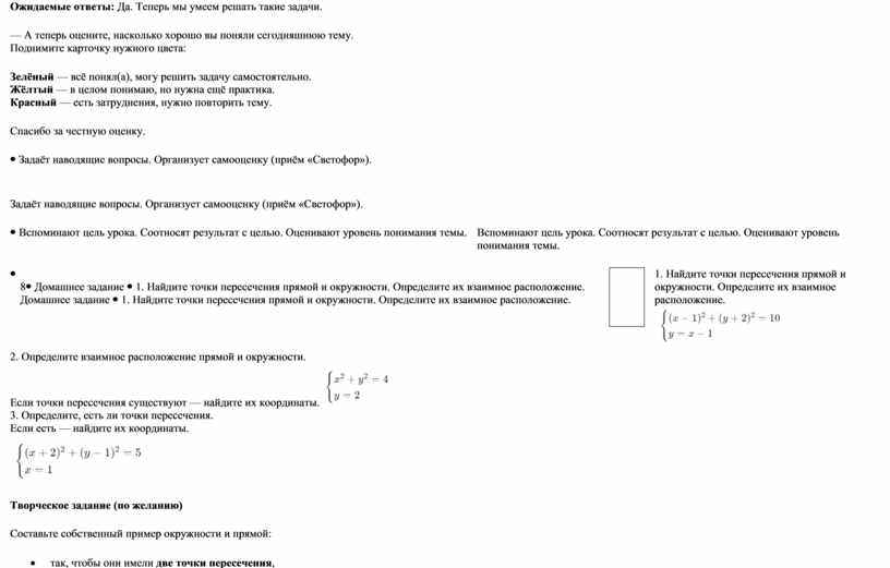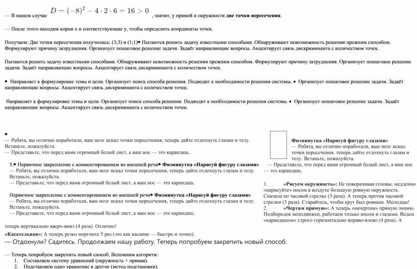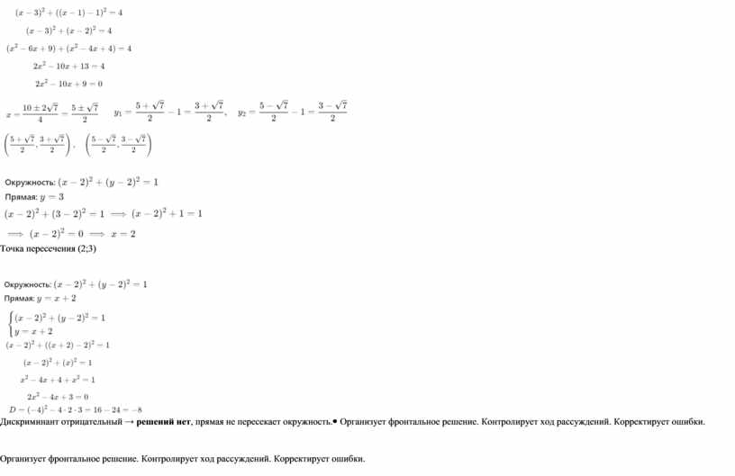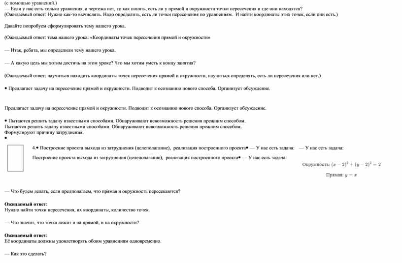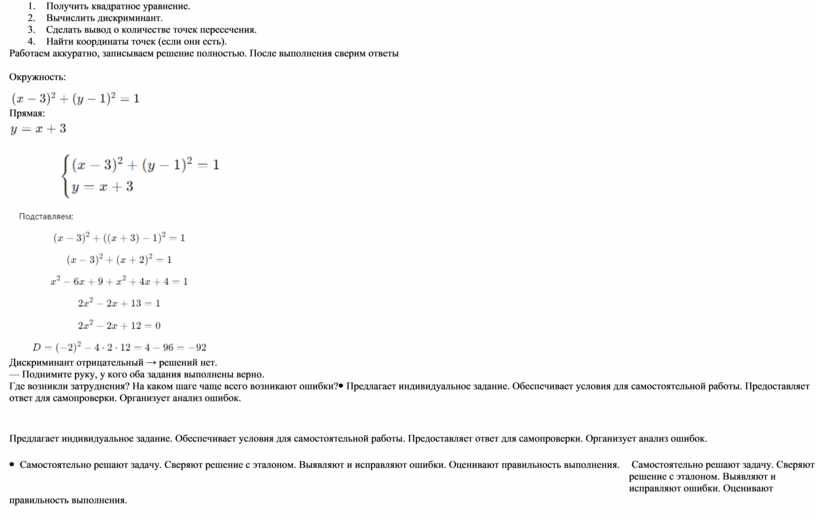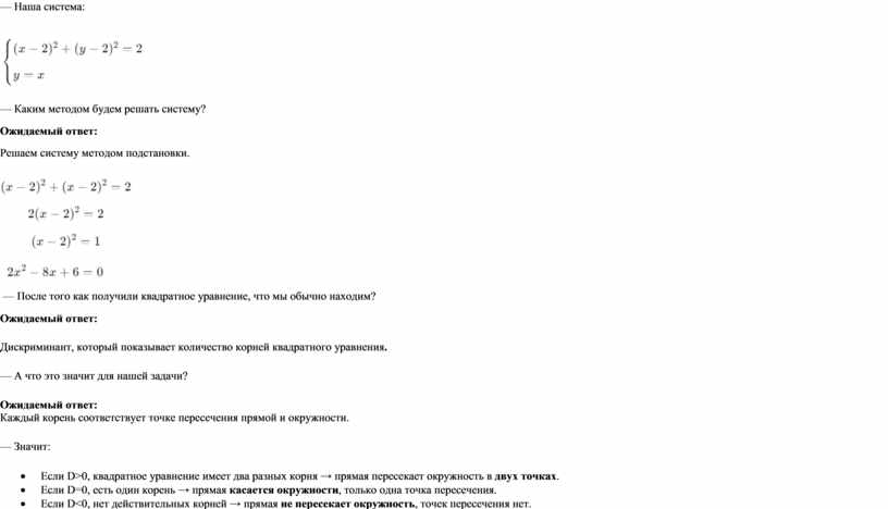 — Что будем делать, если предполагаем, что прямая и окружность пересекаются? Ожидаемый ответ: — Что значит, что точка лежит и на прямой, и на окружности? Ожидаемый ответ: — Как это сделать? Ожидаемый ответ: — Наша система: