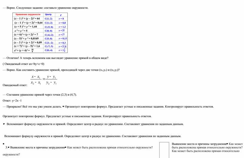 Вспоминают формулу окружности и прямой. Определяют центр и радиус по уравнению. Составляют уравнения по заданным данным.