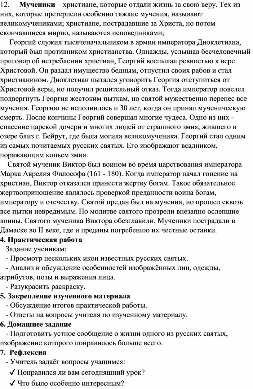 12. Мученики – христиане, которые отдали жизнь за свою веру. Тех из них, которые претерпели особенно тяжкие мучения, называют великомучениками; христиане, пострадавшие за Христа, но потом скончавшиеся мирно, называются исповедниками;