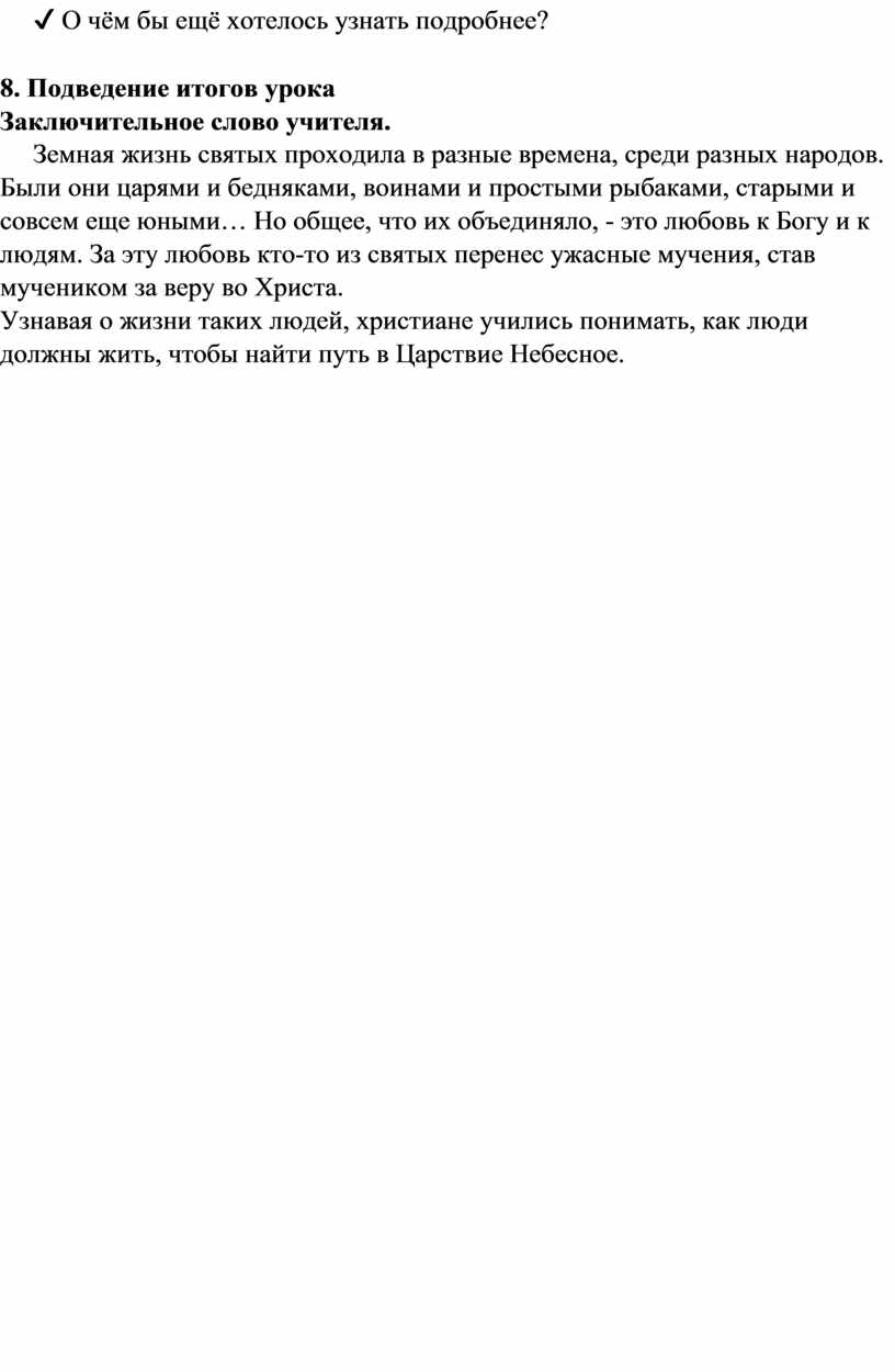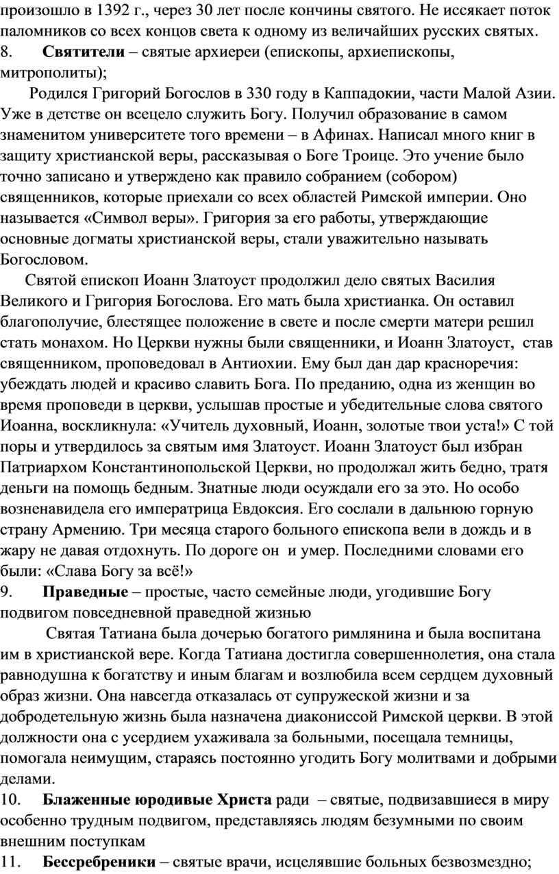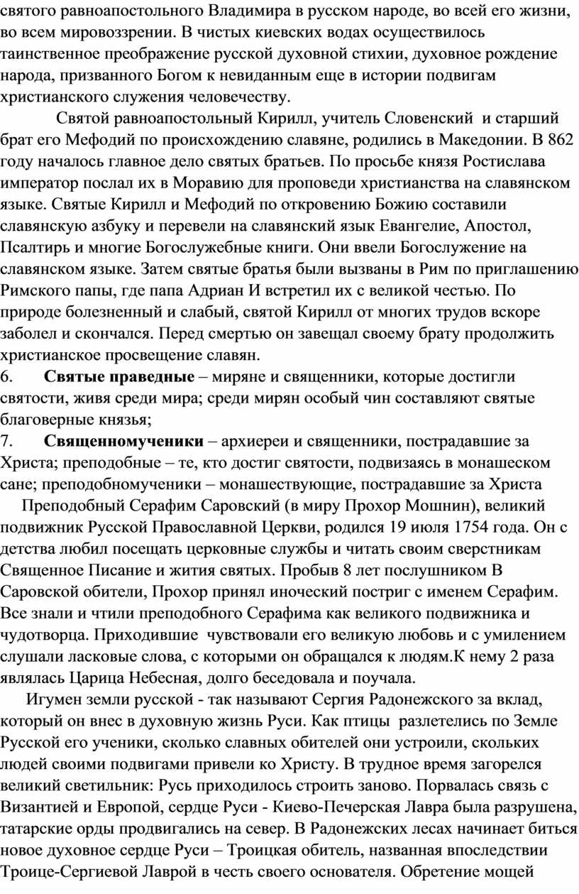 • Стремление к познанию культурного и исторического контекста жизни и деятельности русских святых, осознание значимости нравственных ценностей и идеалов, отражённых в образах святых.