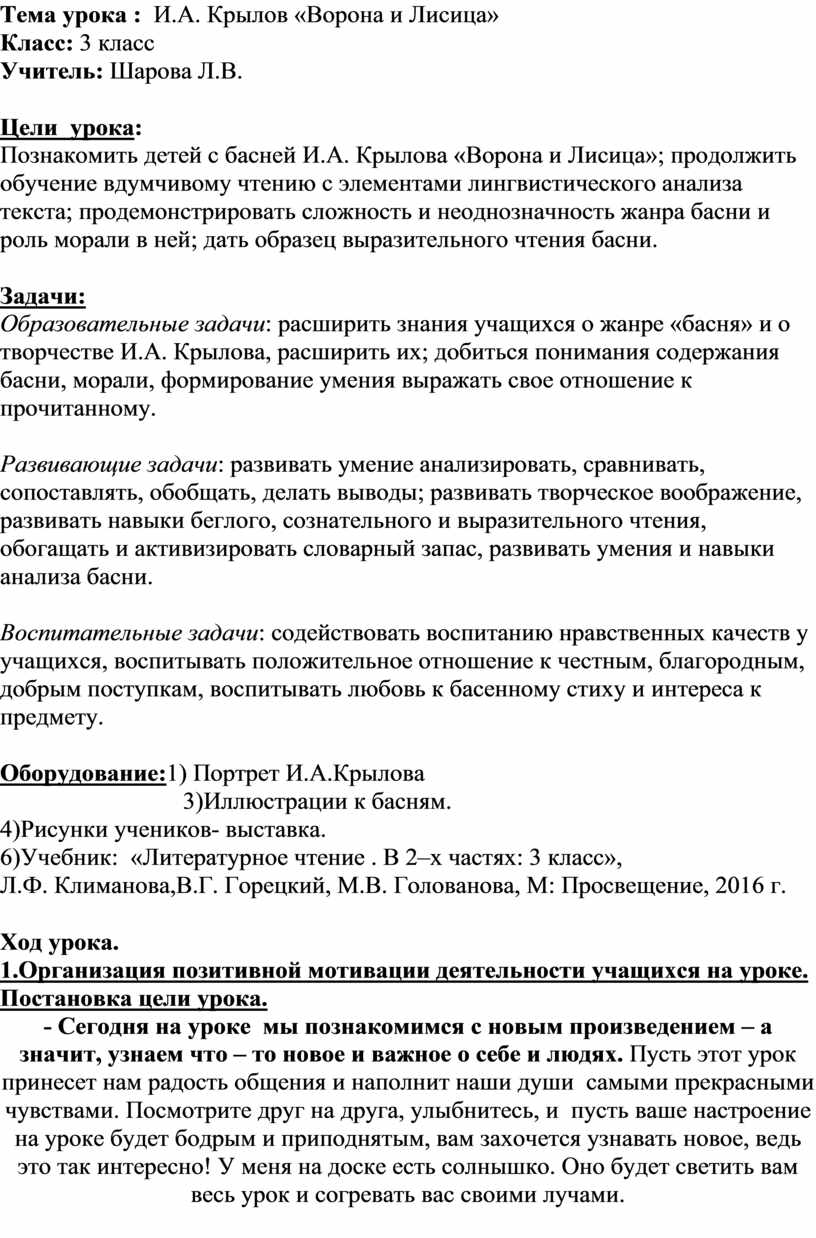 Познакомить детей с басней И.А. Крылова «Ворона и Лисица»; продолжить обучение вдумчивому чтению с элементами лингвистического анализа текста; продемонстрировать сложность и неоднозначность жанра басни и роль морали в ней; дать образец выразительного чтения басни.