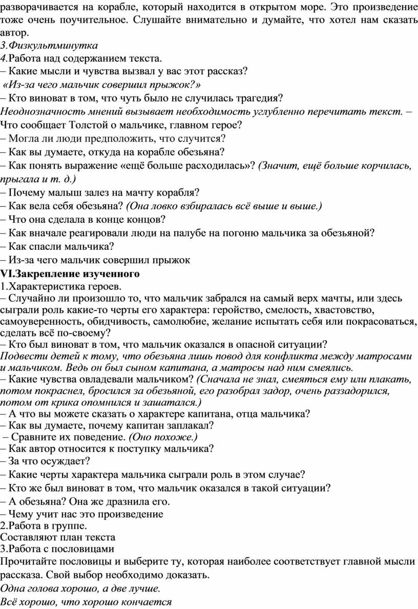 – Какие чувства овладевали мальчиком? (Сначала не знал, смеяться ему или плакать, потом покраснел, бросился за обезьяной, его разобрал задор, очень раззадорился, потом от крика опомнился и зашатался.)