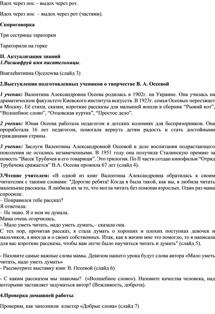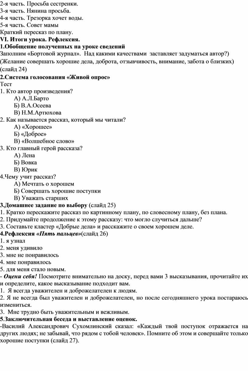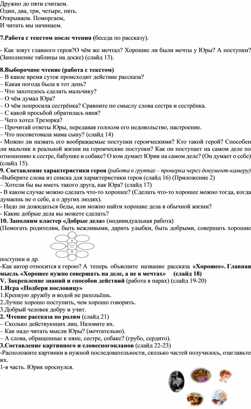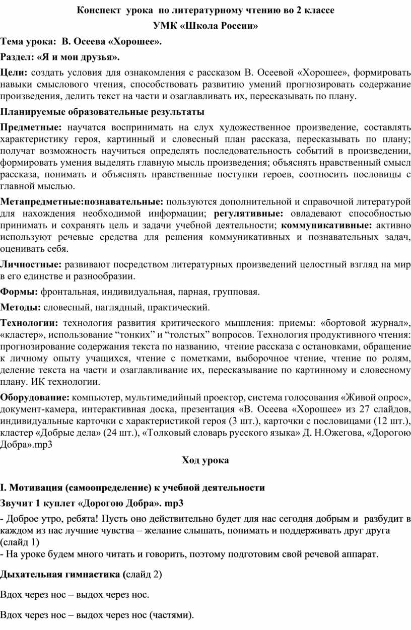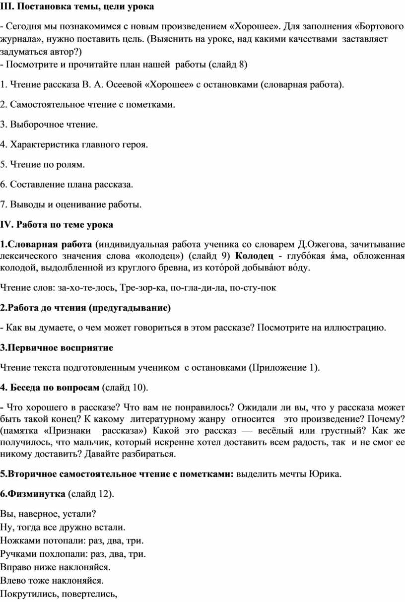 Цели: создать условия для ознакомления с рассказом В. Осеевой «Хорошее», формировать навыки смыслового чтения, способствовать развитию умений прогнозировать содержание произведения, делить текст на части и озаглавливать их, пересказывать по плану.