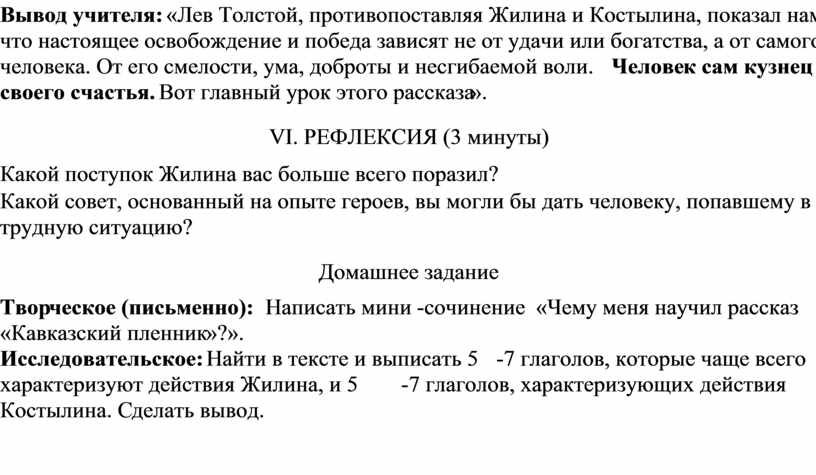 · Вывод учителя: «Лев Толстой, противопоставляя Жилина и Костылина, показал нам, что настоящее освобождение и победа зависят не от удачи или богатства, а от самого человека. От его смелости, ума, доброты и несгибаемой воли. Человек сам кузнец своего счастья. Вот главный урок этого рассказа».