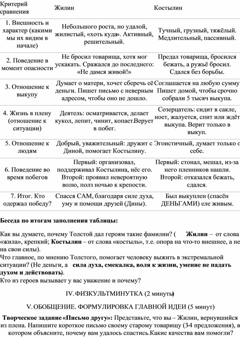 Тема: Л.Н. Толстой «Кавказский пленник». Сравнительная характеристика Жилина и Костылина.