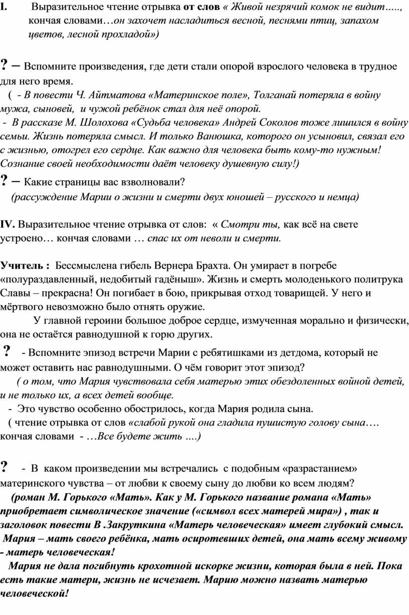 Тип урока: урок-беседа в форме диалога по повести В. Закруткина «Матерь человеческая», продолжение темы «У войны не женское лицо»,