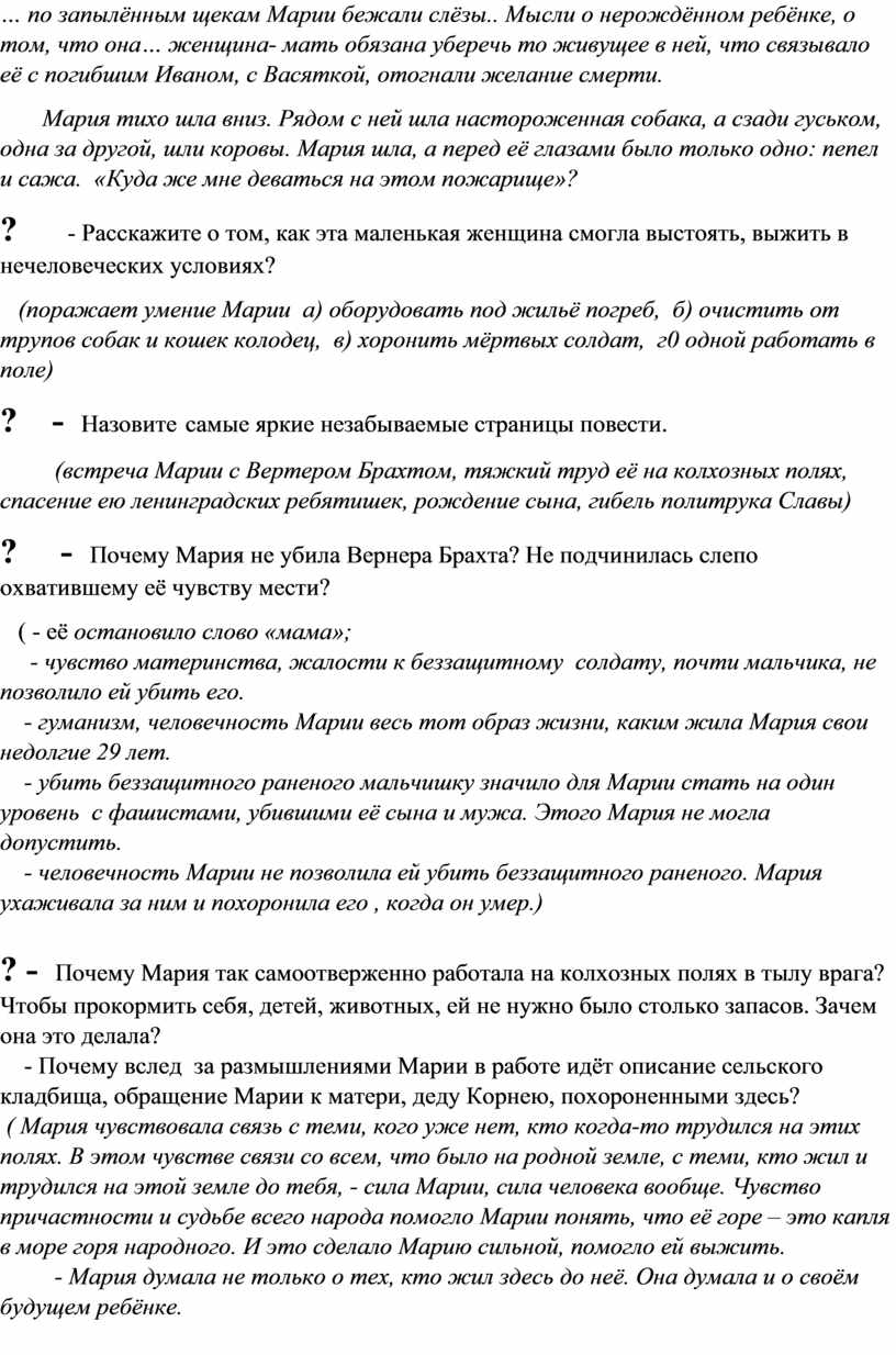Учитель: Великая Отечественная война принесла людям тяжелейшие испытания и смерть. Ворвалась она и в семью героини повести. На глазах Марии фашисты повесили мужа и десятилетнего сына, сожгли хутор, а всё поселение его (около 100 человек) погнали в Германию; и Мария, чудом спаслась в кукурузном поле, осталась «одна на чадной, повитой чёрным дымом, овеянной смертью земле…»