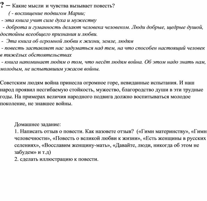 1. Написать отзыв о повести. Как назовете отзыв? («Гимн материнству», «Гимн человечности», «Повесть о великой любви к жизни», «Есть женщины в русских селениях», «Восславим женщину-мать», «Давайте, люди, никогда об этом не забудем» и т.д)
