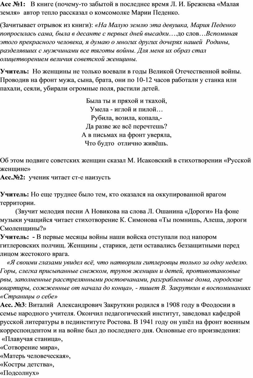 (Зачитывает отрывок из книги): «На Малую землю эта девушка, Мария Педенко попросилась сама, была в десанте с первых дней высадки….до слов…Вспоминая этого прекрасного человека, я думаю о многих других дочерях нашей Родины, разделявших с мужчинами все тяготы войны. Для меня их образ стал олицетворением величия советской женщины.
