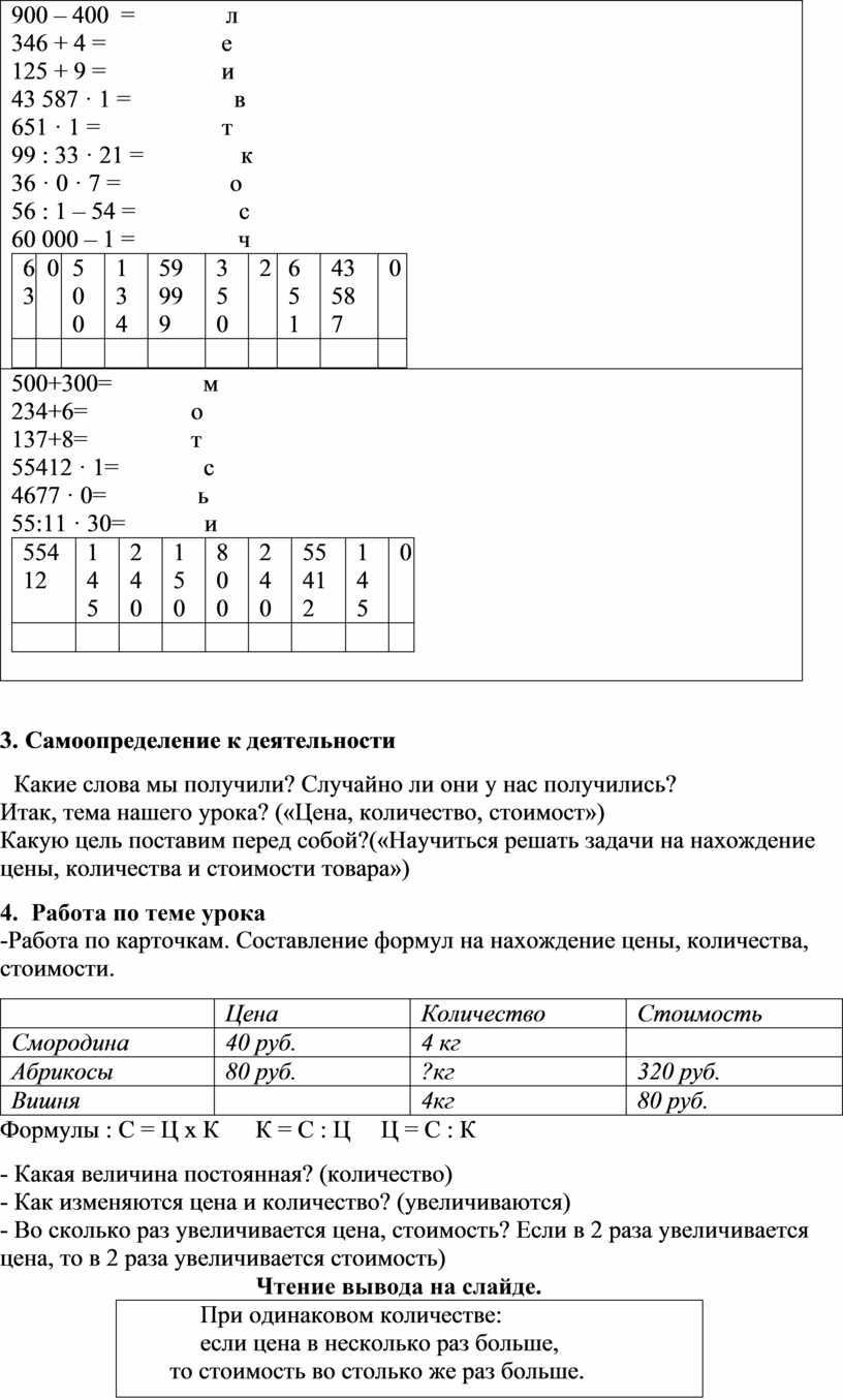 -Работа по карточкам. Составление формул на нахождение цены, количества, стоимости.
