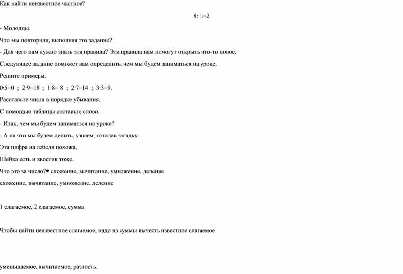 Как найти неизвестное частное? 8: =2 - Молодцы. Что мы повторили, выполняя это задание? - Для чего нам нужно знать эти правила? Эти правила нам помогут открыть что-то новое. Следующее задание поможет нам определить, чем мы будем заниматься на уроке. Решите примеры. 0∙5=0 ; 2∙9=18 ; 1∙8= 8 ; 2∙7=14 ; 3∙3=9. Расставьте числа в порядке убывания. С помощью таблицы составьте слово. - Итак, чем мы будем заниматься на уроке? - А на что мы будем делить, узнаем, отгадав загадку. Эта цифра на лебедя похожа, Шейка есть и хвостик тоже. Что это за число? |