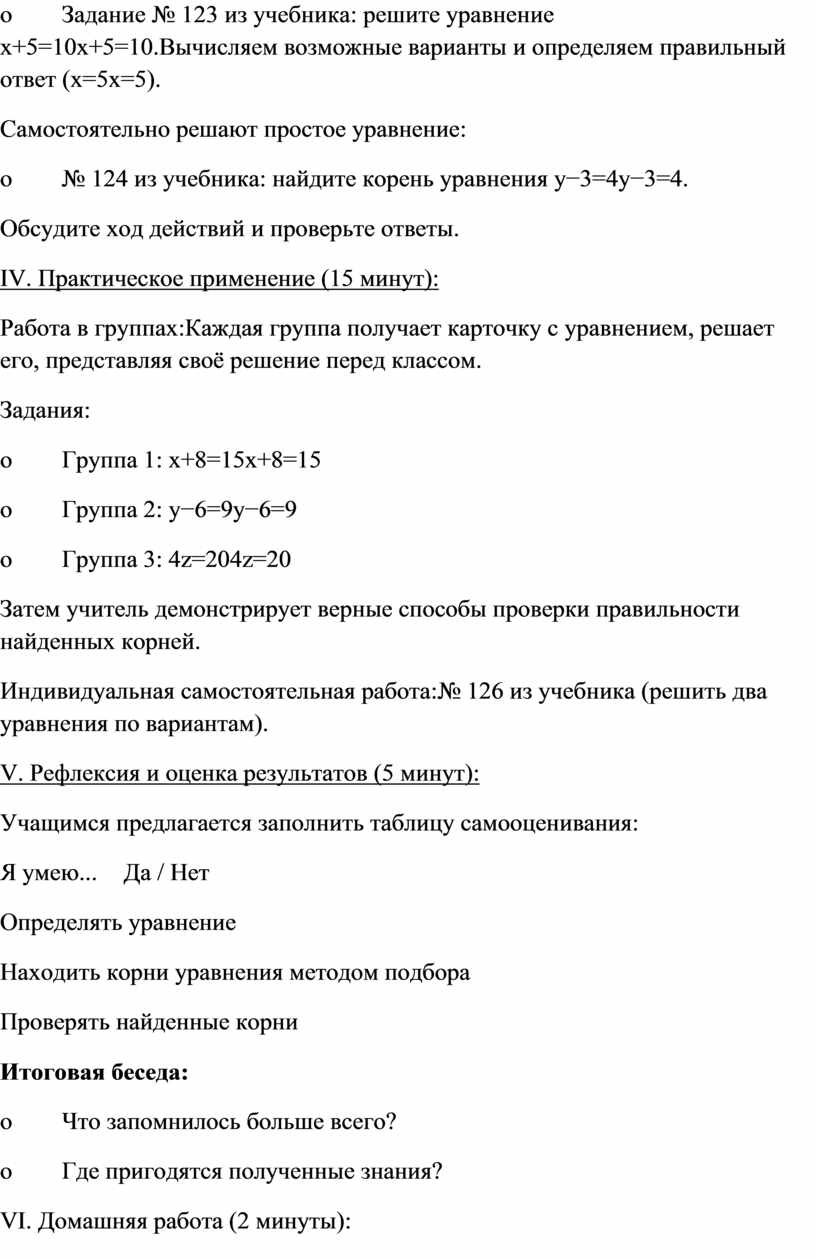 o Умеют решать простейшие уравнения подбором и проверять найденные корни.