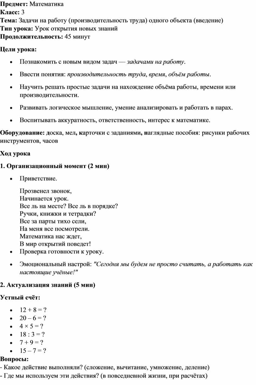 Оборудование: доска, мел, карточки с заданиями, наглядные пособия: рисунки рабочих инструментов, часов