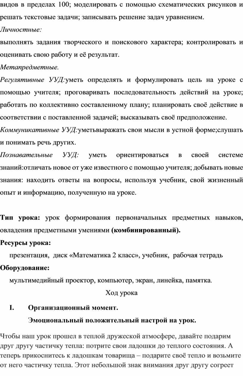 уметь находить периметр прямоугольника разными способами; уметь использовать математическую терминологию при составлении и чтении математических неравенств; выполнять письменные вычисления изученных видов в пределах 100; моделировать с помощью схематических рисунков и решать текстовые задачи; записывать решение задач уравнением.
