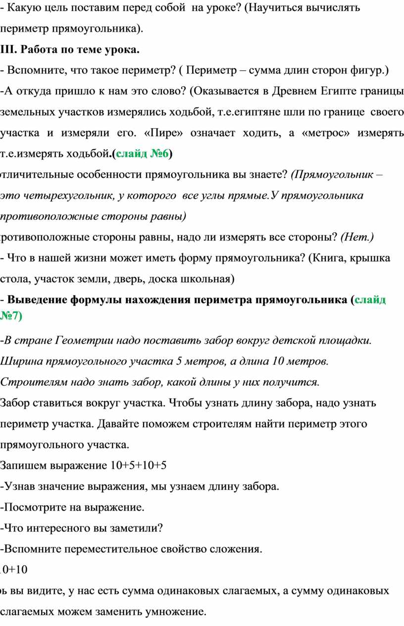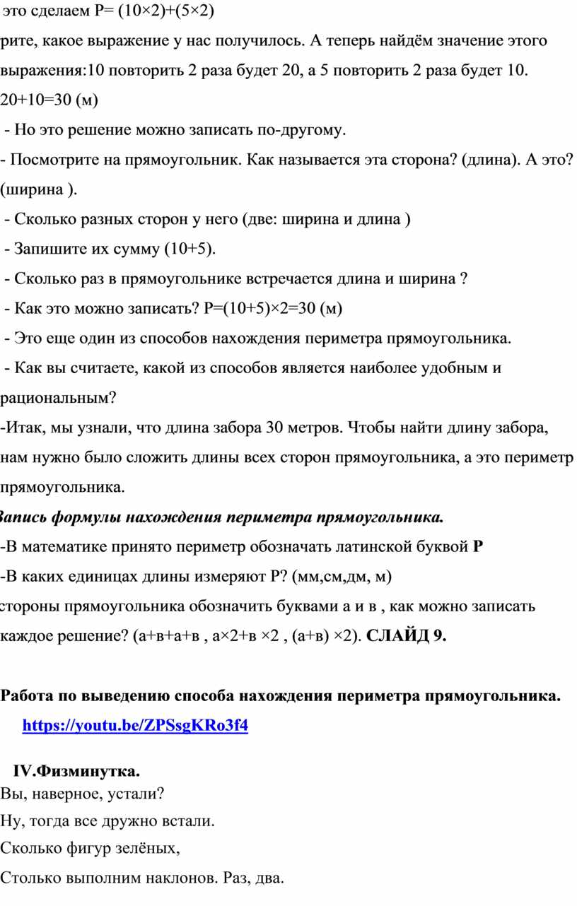 - Выведение формулы нахождения периметра прямоугольника (слайд №7)