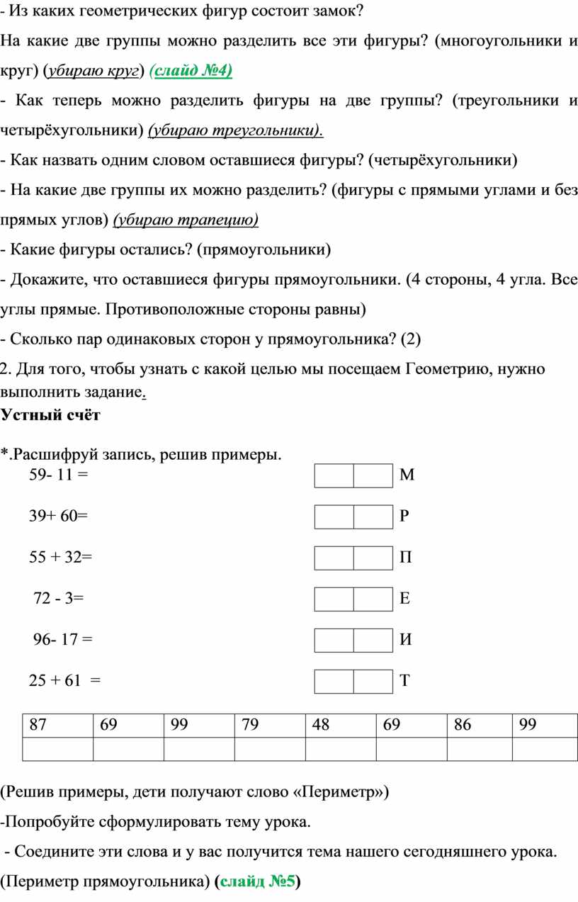 (Решив примеры, дети получают слово «Периметр»)