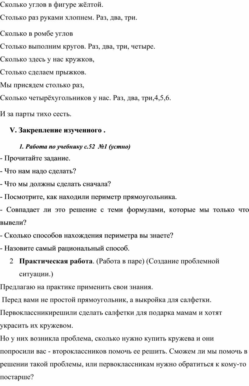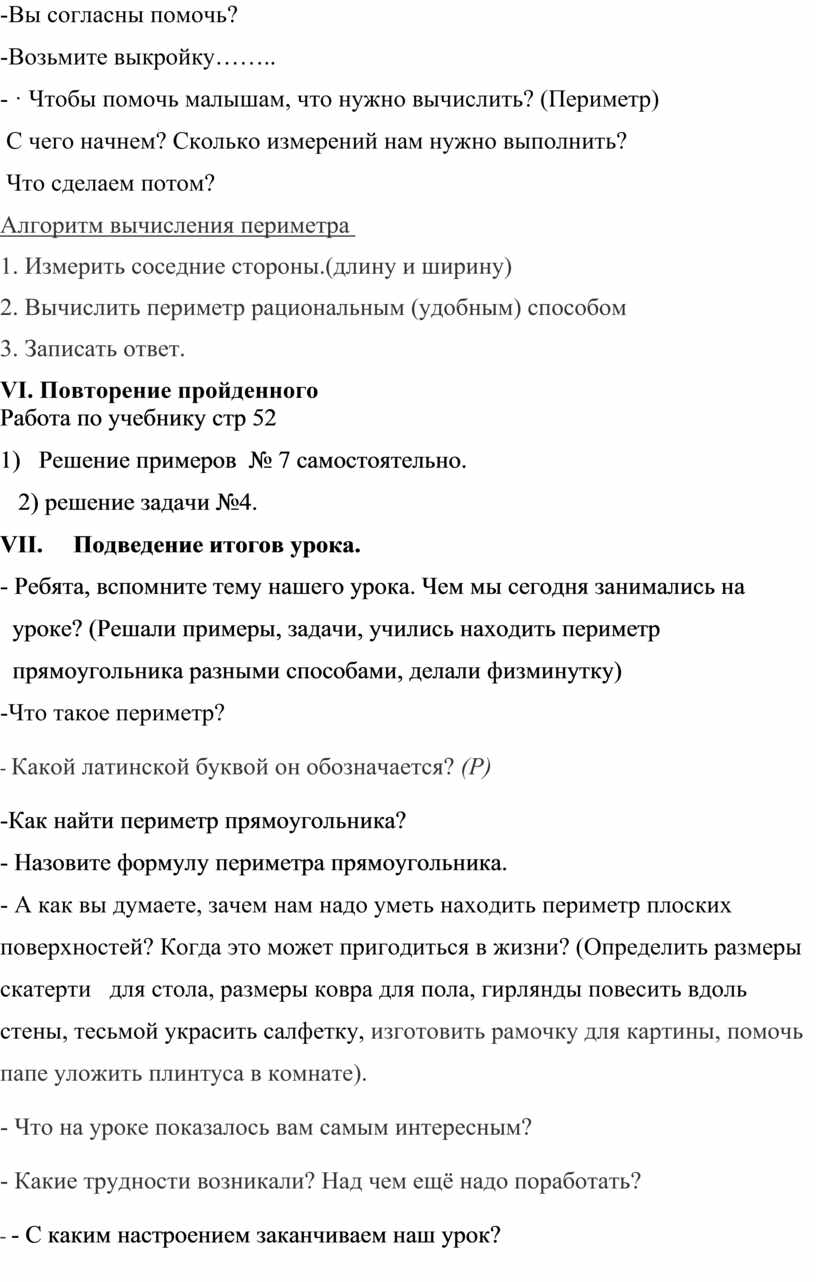 - А как вы думаете, зачем нам надо уметь находить периметр плоских поверхностей? Когда это может пригодиться в жизни? (Определить размеры скатерти для стола, размеры ковра для пола, гирлянды повесить вдоль стены, тесьмой украсить салфетку, изготовить рамочку для картины, помочь папе уложить плинтуса в комнате).