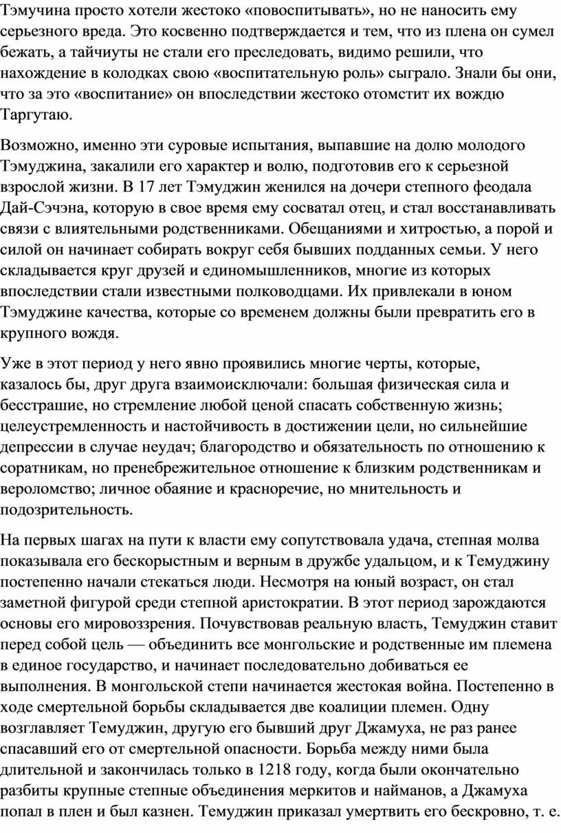 Отрочество Тэмучина прошло в суровой борьбе за выживание. Помощи ждать было неоткуда, да и не принято было у монголов заниматься «благотворительностью». Уже в этот период у будущего полководца проявились стремление к верховодству любой ценой и пренебрежение к чужой жизни. Так, в пылу детской ссоры он убил брата Бэктэра, причем, как отмечается в «Сокровенном сказании», послал стрелу ему в спину.