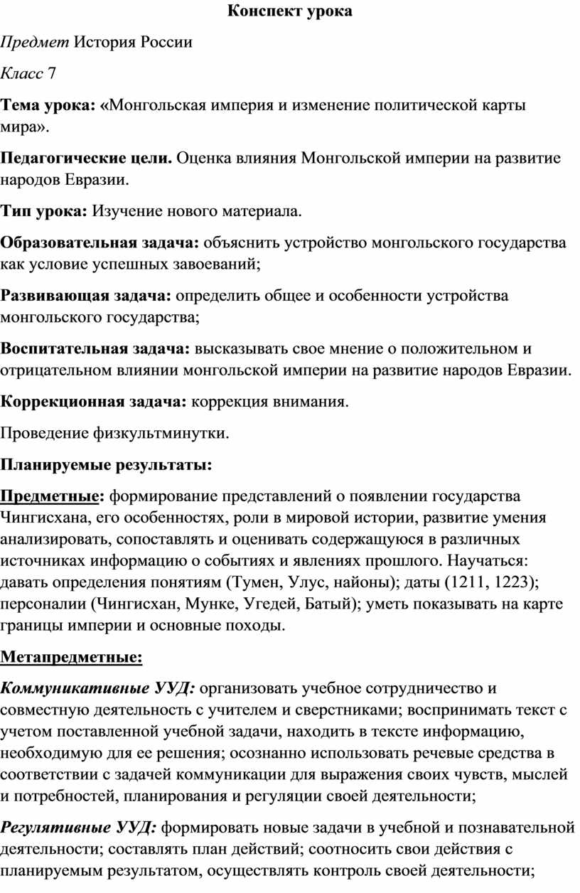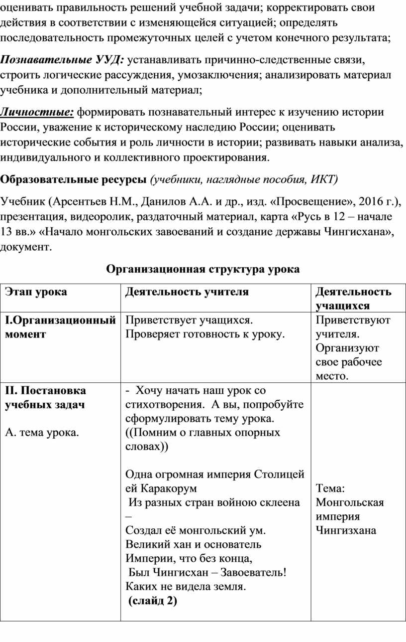Предметные: формирование представлений о появлении государства Чингисхана, его особенностях, роли в мировой истории, развитие умения анализировать, сопоставлять и оценивать содержащуюся в различных источниках информацию о событиях и явлениях прошлого. Научаться: давать определения понятиям (Тумен, Улус, найоны); даты (1211, 1223); персоналии (Чингисхан, Мунке, Угедей, Батый); уметь показывать на карте границы империи и основные походы.