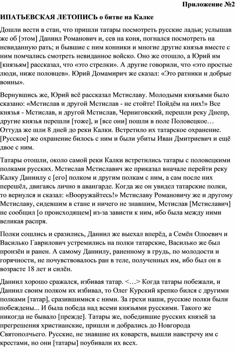 3. Битва на Калке. Первое столкновение Руси с монголо-татарами произошло в битве на реке Калке. Запишем дату сражения в тетради – В половецких степях и на границах Руси действовал отборный отряд войска Чингисхана под руководством его лучших полководцев — молодого талантливого Джэбэ и умудренного опытом старого Субэдэя. Половецкий хан Котян, в пределы которого вступили монголы, обратился к русским князьям за помощью. Прочитайте отрывок из Ипатьевской летописи о битве на Калке (см. Приложение №2) и ответьте на два вопроса. 1. Чем можно объяснить трагический для Руси исход битвы на Калке? Могла ли она закончиться иначе? 2. Каково историческое значение данной битвы?