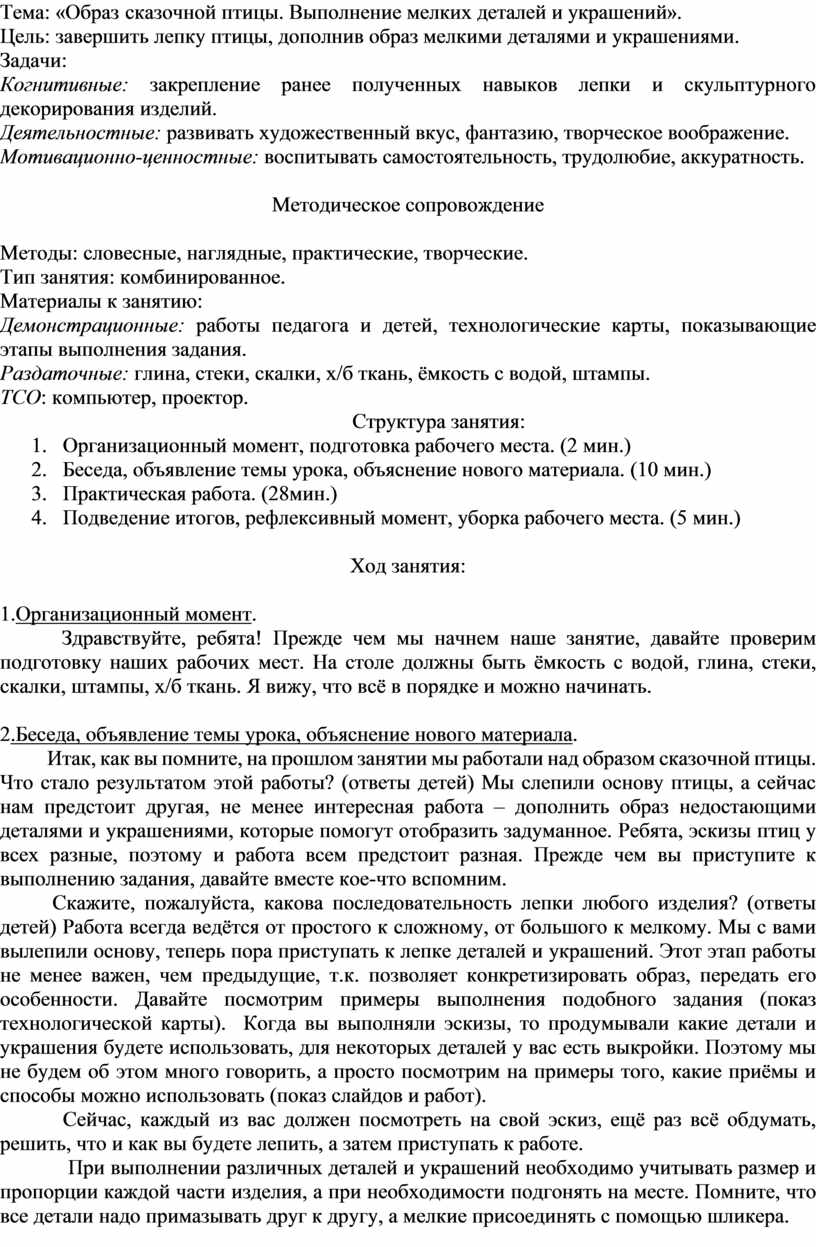 Итак, как вы помните, на прошлом занятии мы работали над образом сказочной птицы. Что стало результатом этой работы? (ответы детей) Мы слепили основу птицы, а сейчас нам предстоит другая, не менее интересная работа – дополнить образ недостающими деталями и украшениями, которые помогут отобразить задуманное. Ребята, эскизы птиц у всех разные, поэтому и работа всем предстоит разная. Прежде чем вы приступите к выполнению задания, давайте вместе кое-что вспомним.