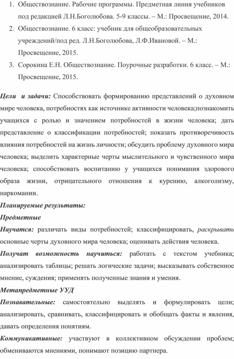 4. Обществознание. 6 класс: учебник для общеобразовательных учреждений/под ред. Л.Н.Боголюбова, Л.Ф.Ивановой. – М.: Просвещение, 2015.