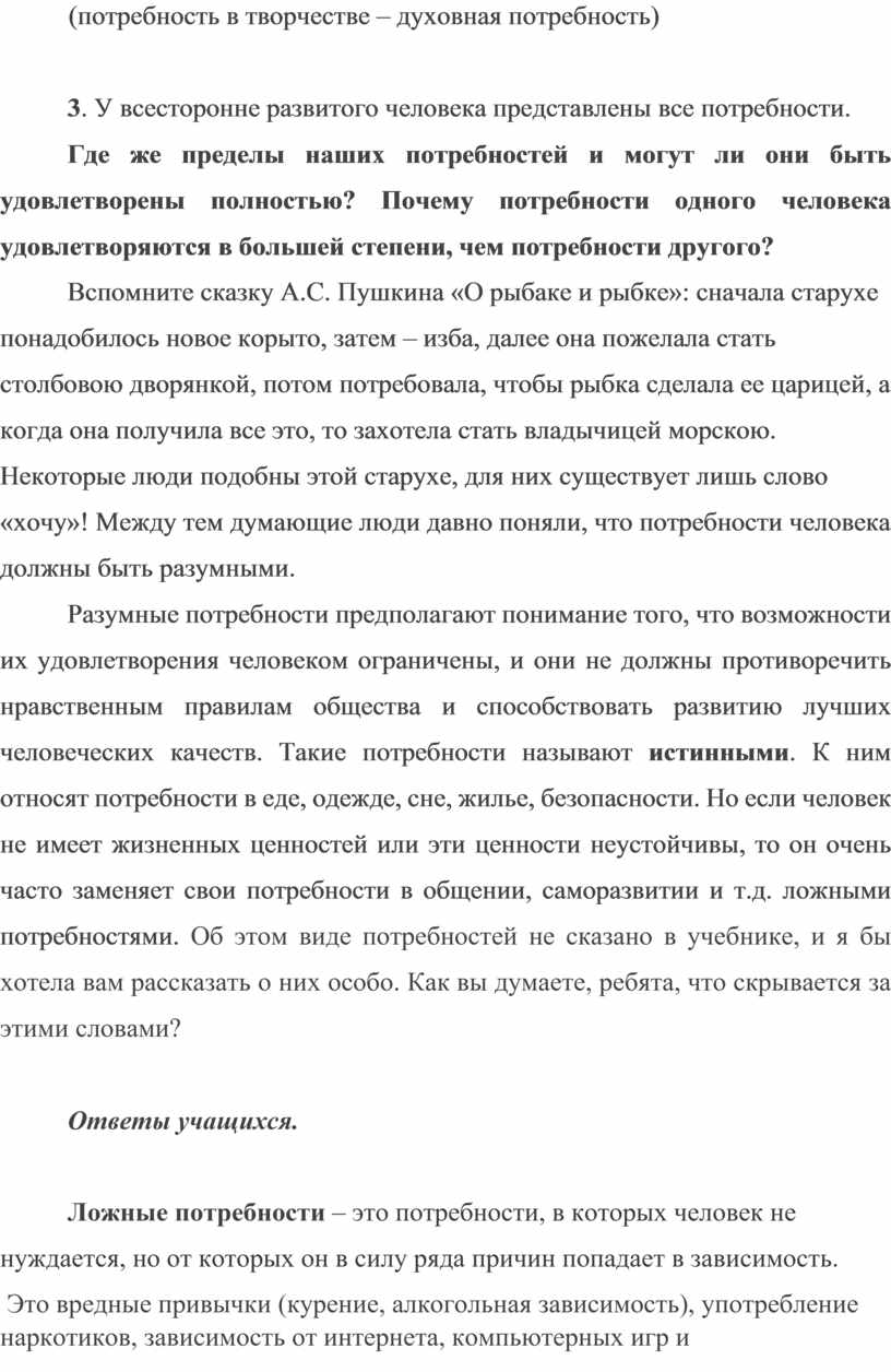 Разумные потребности предполагают понимание того, что возможности их удовлетворения человеком ограничены, и они не должны противоречить нравственным правилам общества и способствовать развитию лучших человеческих качеств. Такие потребности называют истинными. К ним относят потребности в еде, одежде, сне, жилье, безопасности. Но если человек не имеет жизненных ценностей или эти ценности неустойчивы, то он очень часто заменяет свои потребности в общении, саморазвитии и т.д. ложными потребностями. Об этом виде потребностей не сказано в учебнике, и я бы хотела вам рассказать о них особо. Как вы думаете, ребята, что скрывается за этими словами?