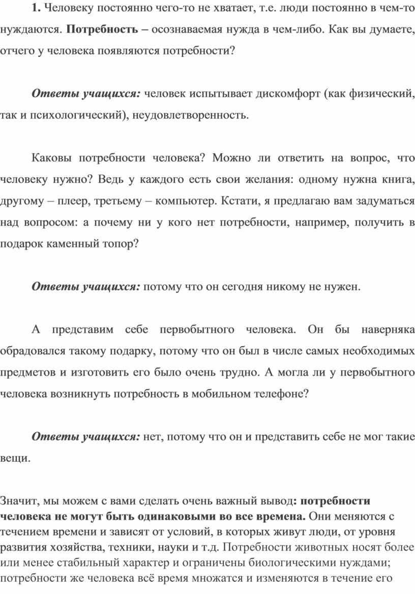 Значит, мы можем с вами сделать очень важный вывод: потребности человека не могут быть одинаковыми во все времена. Они меняются с течением времени и зависят от условий, в которых живут люди, от уровня развития хозяйства, техники, науки и т.д. Потребности животных носят более или менее стабильный характер и ограничены биологическими нуждами; потребности же человека всё время множатся и изменяются в течение его жизни: человеческое общество создаёт у людей потребности, которых не было у предыдущих поколений.
