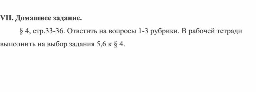 § 4, стр.33-36. Ответить на вопросы 1-3 рубрики. В рабочей тетради выполнить на выбор задания 5,6 к § 4.
