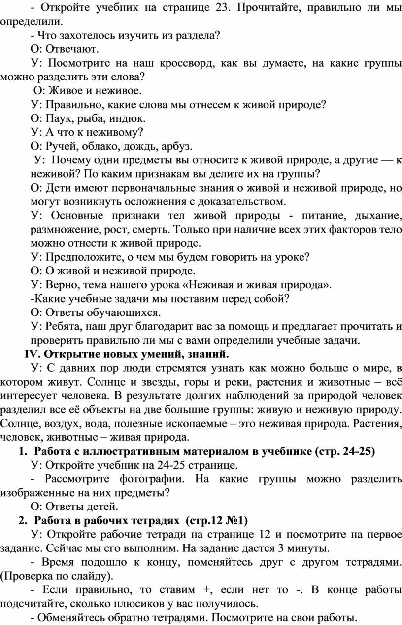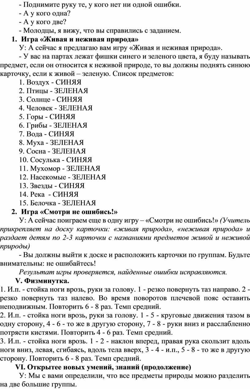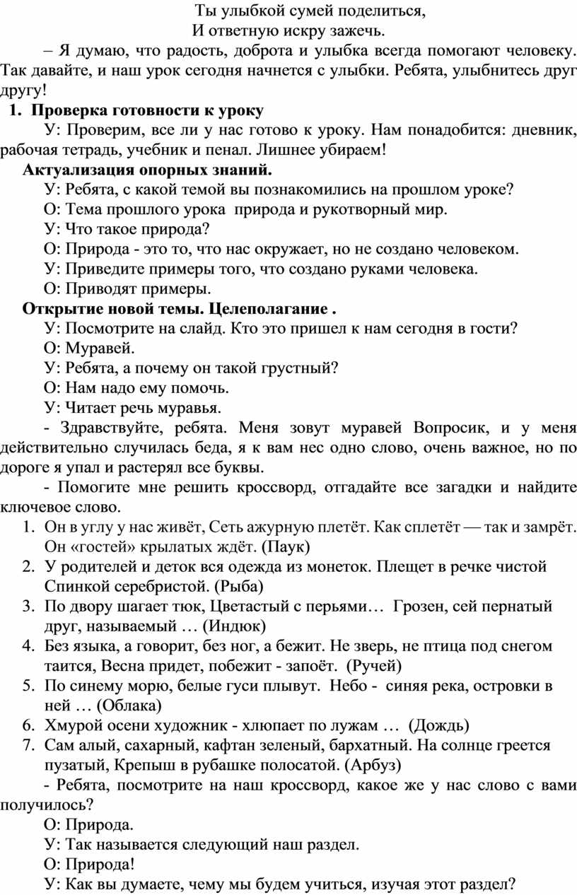 У: С давних пор люди стремятся узнать как можно больше о мире, в котором живут. Солнце и звезды, горы и реки, растения и животные – всё интересует человека. В результате долгих наблюдений за природой человек разделил все её объекты на две большие группы: живую и неживую природу. Солнце, воздух, вода, полезные ископаемые – это неживая природа. Растения, человек, животные – живая природа.