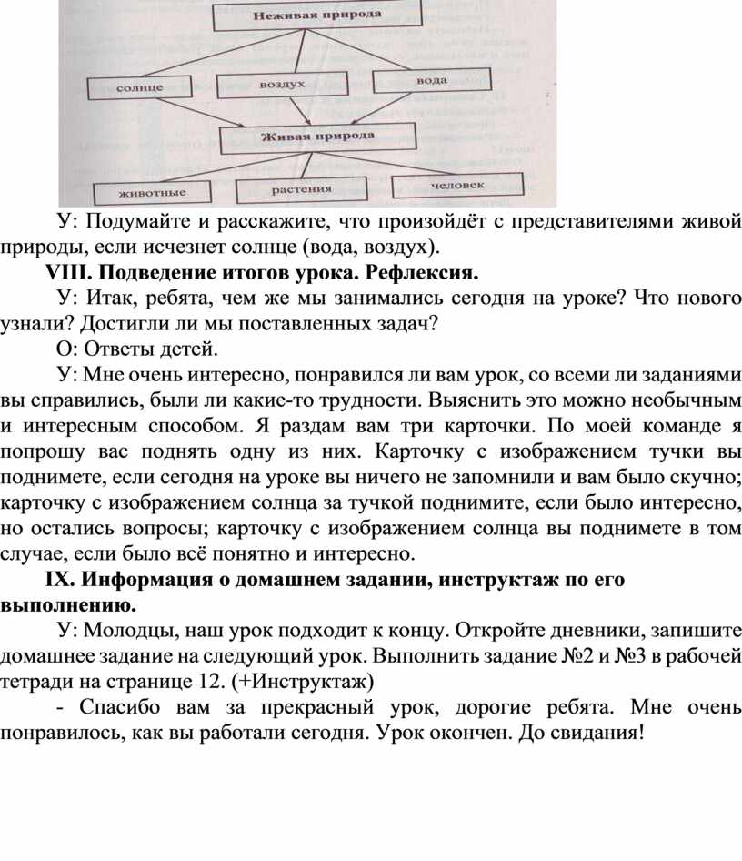 У: Подумайте и расскажите, что произойдёт с представителями живой природы, если исчезнет солнце (вода, воздух).
