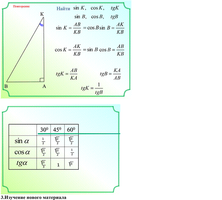 Учитель: кроме этих значений при решении задач вам понадобятся и другие значения синуса, косинуса, тангенса и катангенса при различных угла . Сделайте себе в тетради небольшую тригонометрическую таблицу значений синуса, косинуса, тангенса и катангенса (слайд 8). Запись в тетрадях: