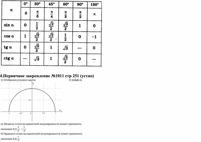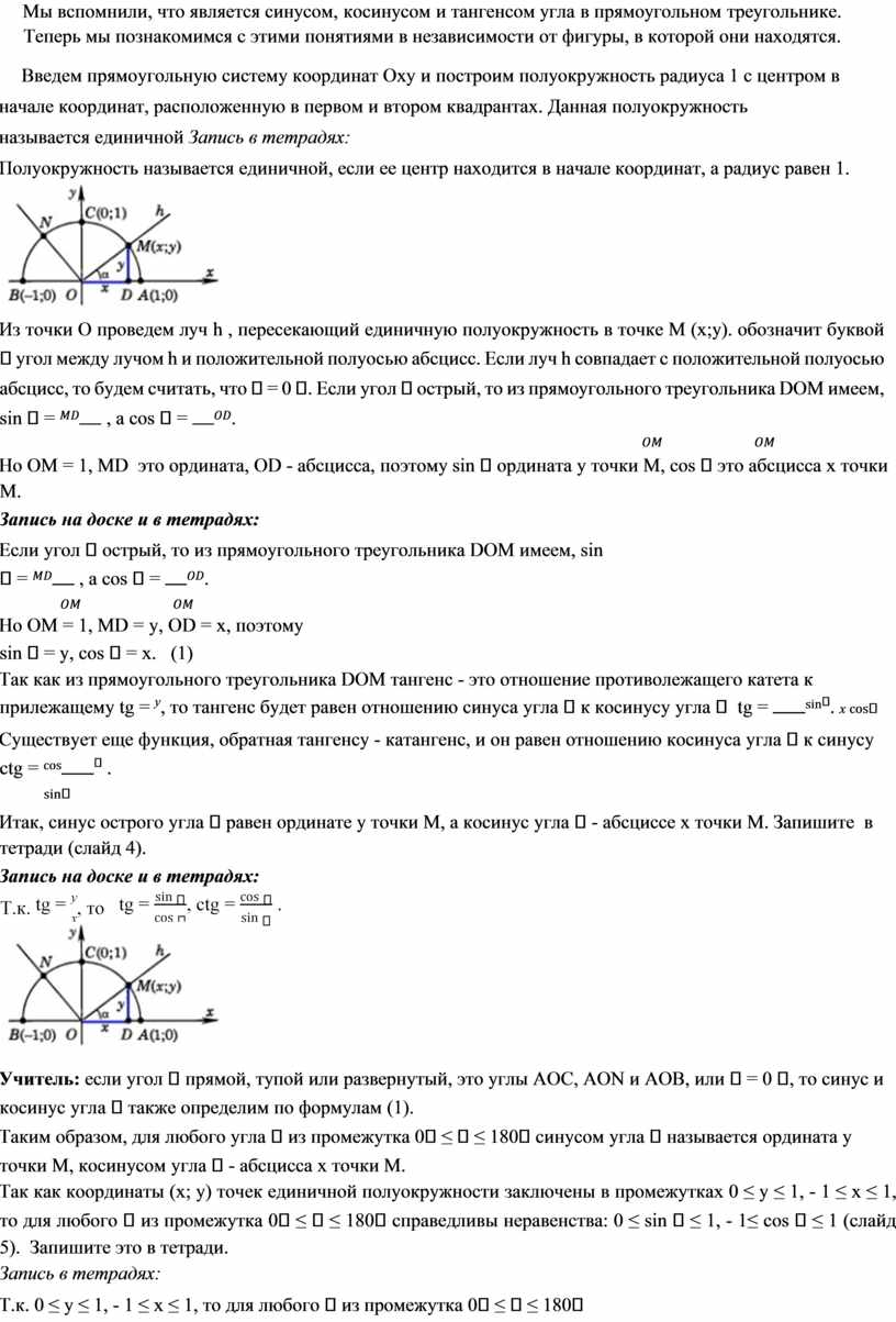 Введем прямоугольную систему координат Оху и построим полуокружность радиуса 1 с центром в начале координат, расположенную в первом и втором квадрантах. Данная полуокружность называется единичной Запись в тетрадях: