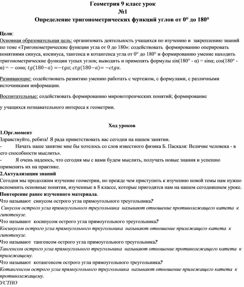 Основная образовательная цель: организовать деятельность учащихся по изучению и закреплению знаний по теме «Тригонометрические функции угла от 0 до 180»: содействовать формированию оперировать понятиями синуса, косинуса, тангенса и котангенса угла от 0° до 180° и формированию умение находить тригонометрические функции тупых углов; выводить и применять формулы sin(180° - α) = sinα; cos(180° - α) = − cosα; 𝑡𝑔(180−𝑎) =−𝑡𝑔𝑎; с𝑡𝑔(180−𝑎)= −с𝑡𝑔𝑎.